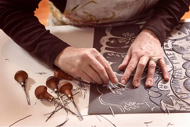 Our print studio is set up for traditional linocut, block printing, and mixed-media experimentation. Led by Jaime Nash, we create custom prints for individuals and small businesses who want the depth and character of true hand printing. Each piece is designed, carved, and printed by hand—layer by layer—using ink, pressure, and patience.