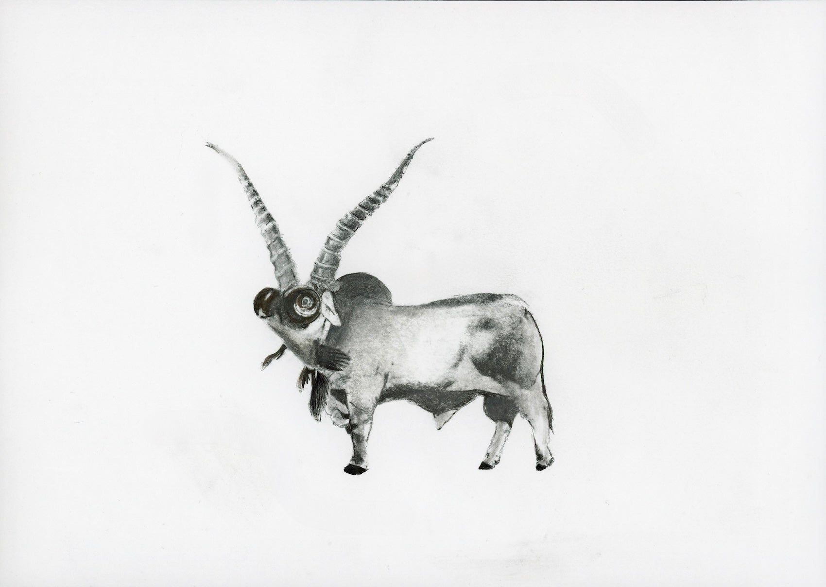 Drawing of bull body with goldfish head and long horns.