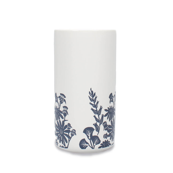 The Woodland Songbird vase by Kate Heiss brings the stillness of the forest indoors. Deep navy glaze sets the backdrop for Heiss’s hand-printed design of birds and botanicals — a quiet moment of nature captured in ceramic.