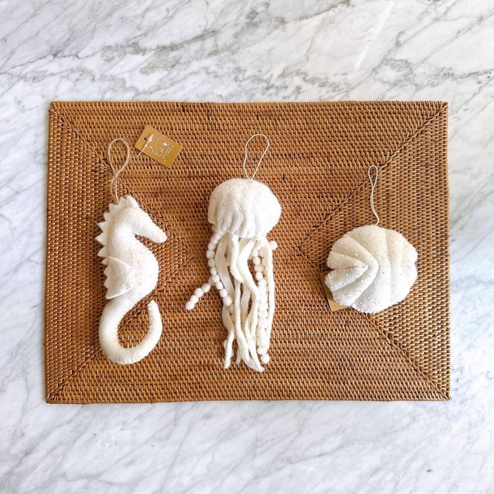 Bring a touch of coastal charm to your holiday décor with our Felt White Sea Life Ornaments. Choose from three handcrafted designs — seahorse, jellyfish, or scallop — each made from eco-friendly wool felt and finished in soft white for an elegant, seaside-inspired look.