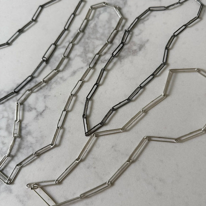 Each chain is hand-fabricated from sterling silver in Shelby Goldsmith’s Portland studio. Every link is formed and soldered by hand, creating subtle variations that make each piece unique. Available in custom lengths between 16"–20", these oxidized and polished finishes reveal the beauty of silver as it changes with wear. A timeless everyday piece made with intention and craft.