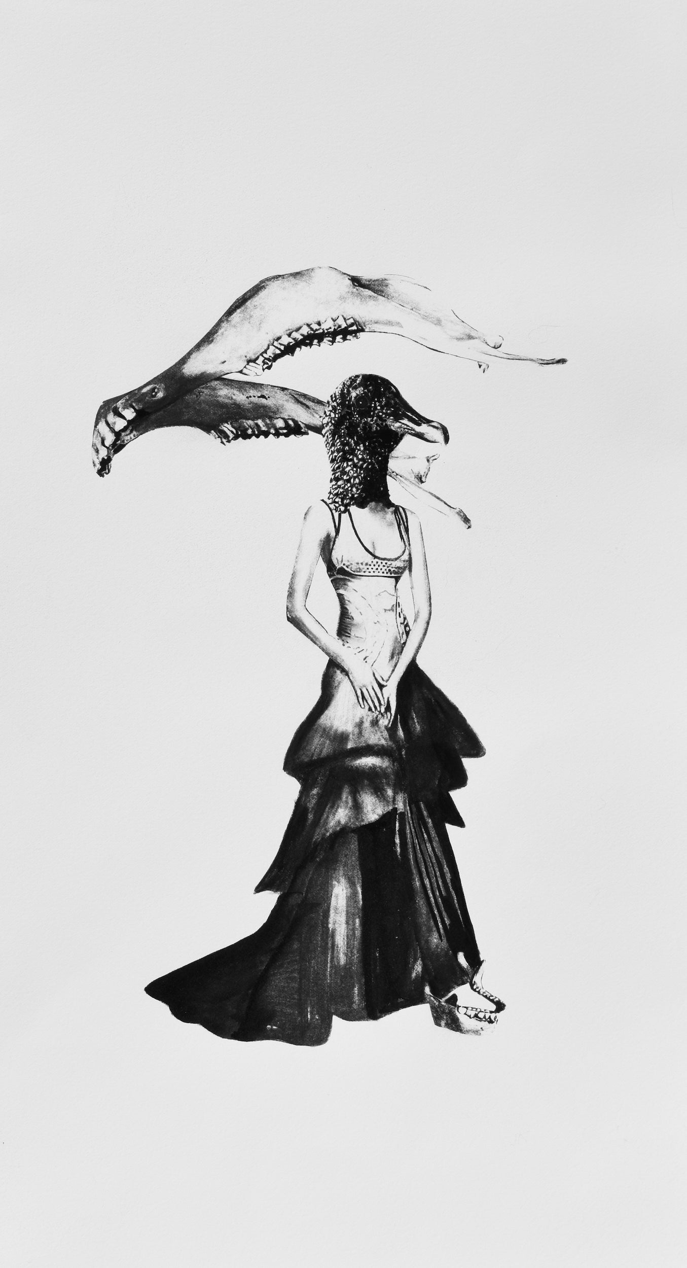 Drawing of a women’s body in a gown with a vulture head andjaw bones above and below.