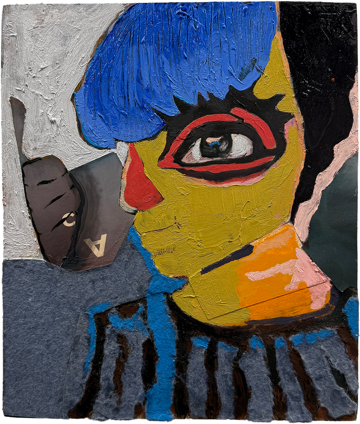 As an ongoing series in the studio, this work in a series of imagined portraits I look to the most immediate aspect of collage often found in the classrooms of grade school construction paper portraits. These works embrace rudimentary form, eccentric color, experimentation, and the untested waters. These low stakes works embrace fun and play. They are portraits of no one but surely must resemble a caricature of someone.