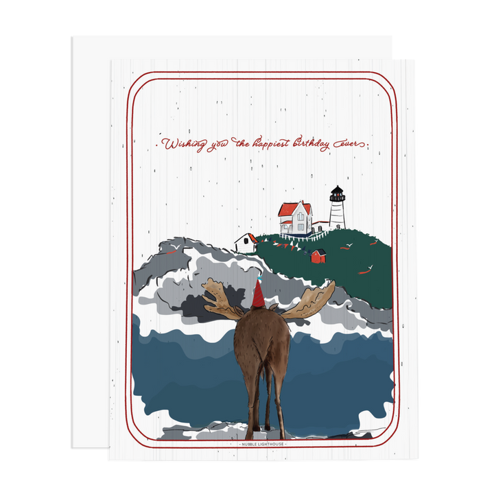 A birthday wish straight from Maine. Featuring a charming moose at Nubble Lighthouse in York, this card delivers small-town warmth with a coastal wink. Printed on bright white stock, blank inside, and paired with an easy-seal envelope. Designed and printed in New England by Ramus & Co.