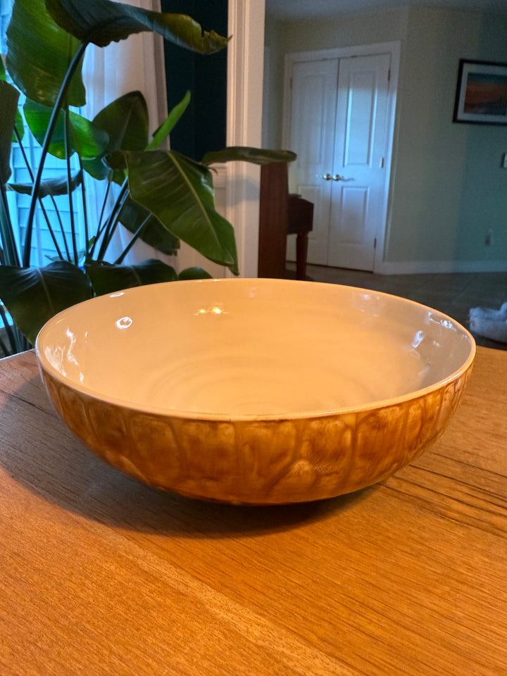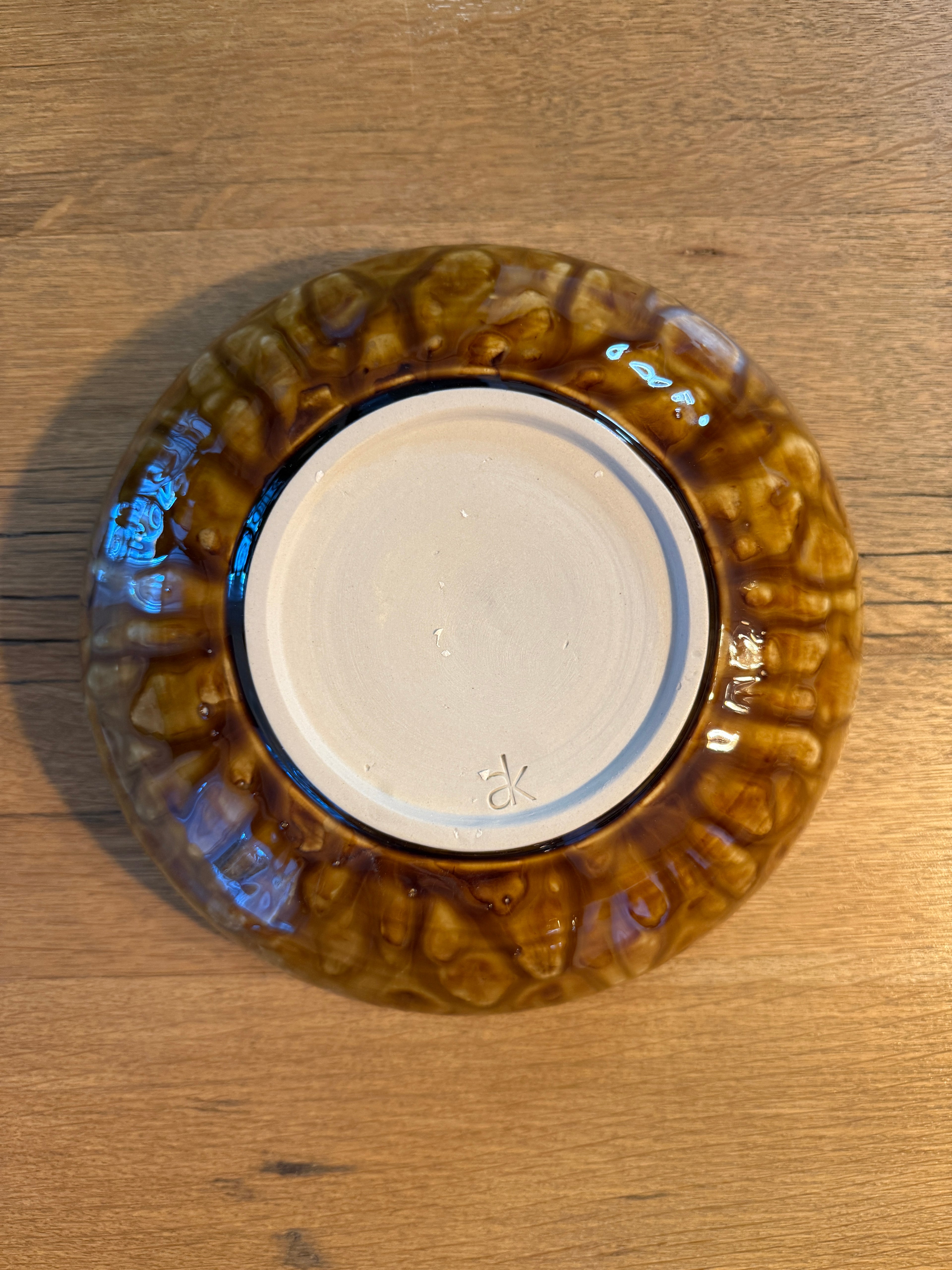 Ashley Kalloch’s Serving Bowl in the “Giraffe” glaze brings playful pattern and organic charm to the table. Hand-thrown and finished in earthy tones with bold surface variation, it’s as much a statement piece as it is a serving vessel. The inside is fully food-safe, while the exterior glaze reveals the raw texture of the clay beneath. Crafted in Freeport, Maine, this bowl embodies the joy of handmade design meant to be used and admired.