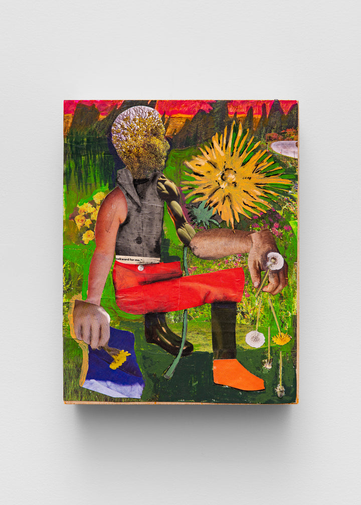 This traditional collage mounted on a panel places a figure in a field of flowers amongst a pink sunset. Rainer Maria Rilke, in Letters to a Young Poet, spoke on knowing the gesture of flowers both in beauty and in the found meanings behind them. This work is a tip of a cap to Rilke and the poetics behind flowers.