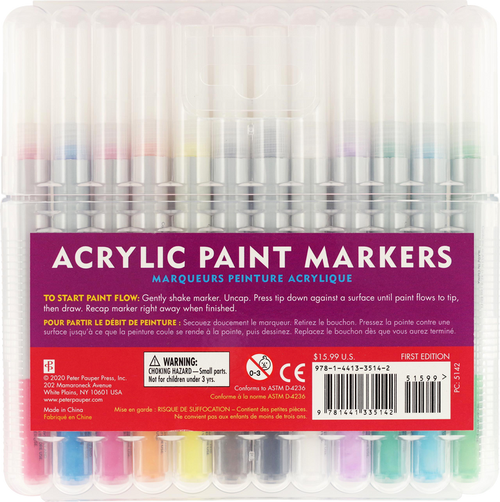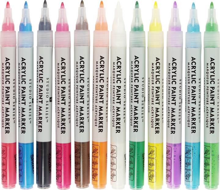 Create bold, vibrant artwork anywhere with this set of 12 premium acrylic paint markers. Designed for versatility, these fine-tip markers work beautifully on paper, glass, wood, stone, ceramic, plastic, and more. Each marker delivers smooth, opaque color that’s fast-drying and water-resistant once set — perfect for crafts, projects, and expressive detail work.