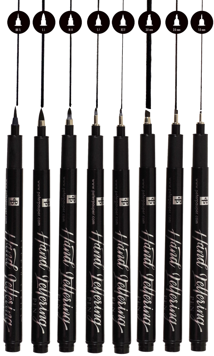 • 8 hand-lettering pens: 3 calligraphy nibs (1.0 mm, 2.0 mm, 3.0 mm) and 5 brush tips (XS, S, M, L, BR)