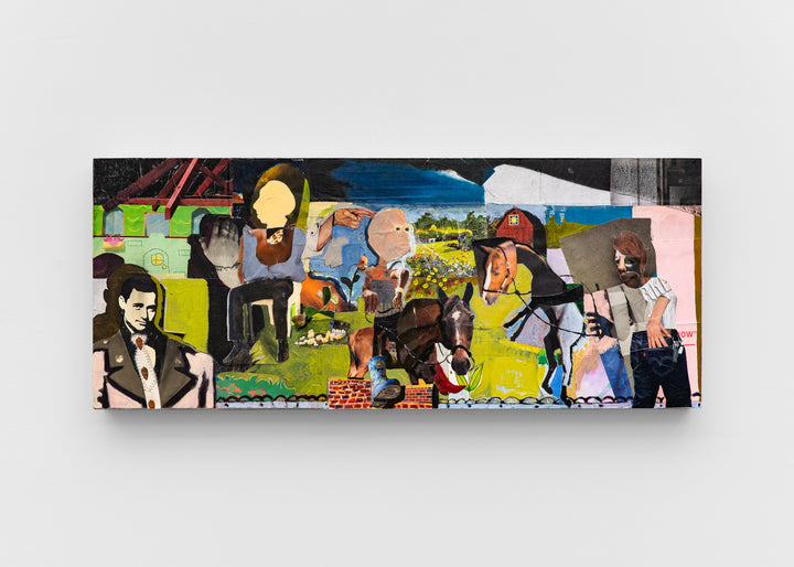 A long drawn out landscape places the viewer in the farmland lush with greenery. Two horseback riders, Equestrians, are in the process of taming or having mounted their steeds. Shifty eyes coming from stallions and their performers we must ask what have we just missed? With work to do the figures have begun to part ways, while onlookers gawk onwards calling in a crowd to confer on what we do not know.