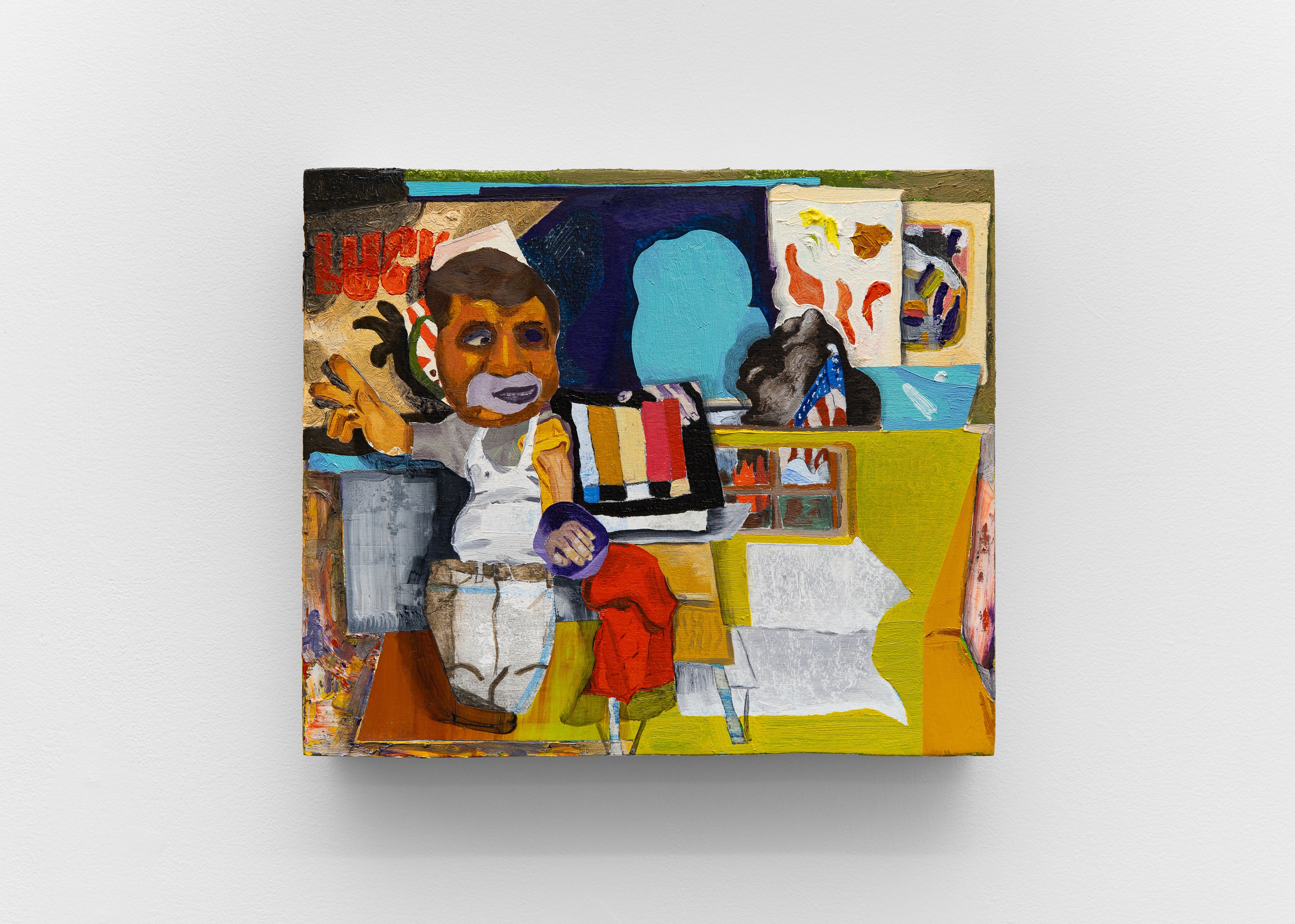 A traditional oil painting on panel painted from observation referencing back to a three-dimensional collage “still-life”. This work is an open ended acknowledgement to living in contemporary America while not explicitly placing the viewer in a specific era.