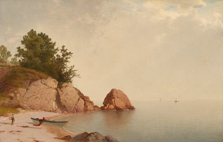 Painted between 1869 and 1872, Beach at Beverly reflects Kensett’s gift for turning familiar New England coastlines into scenes of quiet magic. Soft light washes over sand, water, and sky, creating a sense of calm that stretches across the composition. A rocky outcropping anchors the left side while small figures move gently through the scene, adding a human touch without disturbing its stillness. Kensett’s careful balance of atmosphere, detail, and space transforms an everyday shoreline into a meditation on light, time, and the beauty of the North Shore.